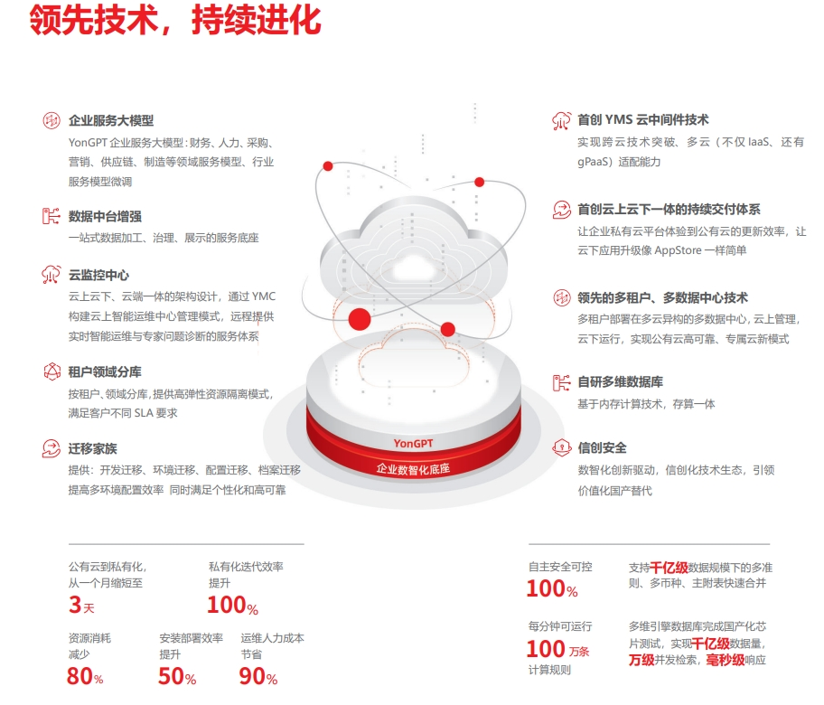 此之外,用友iuap首創云上云下一體的持續交付體系,讓企業私有云平臺體驗到公有云的更新效率,讓云下應用升級像 AppStore 一樣簡單;自研多維數據引擎(存算一體),實現 100% 自主安全可控,支持千億級數據規模下的“多準則、多幣種、主附表”快速合并,一鍵出表。這一技術已經在大型央企中進行了驗證,實現了 1500 家分子公司規模的超大型企業報表的快速合并、一鍵出表;實現了安全可信的國產化信創適配,為企業客戶提供穩固可信、自主可控的數智化平臺服務。比如多維引擎數據庫完成國產化芯片測試,實現千億級數據量,萬級并發檢索,毫秒級響應。