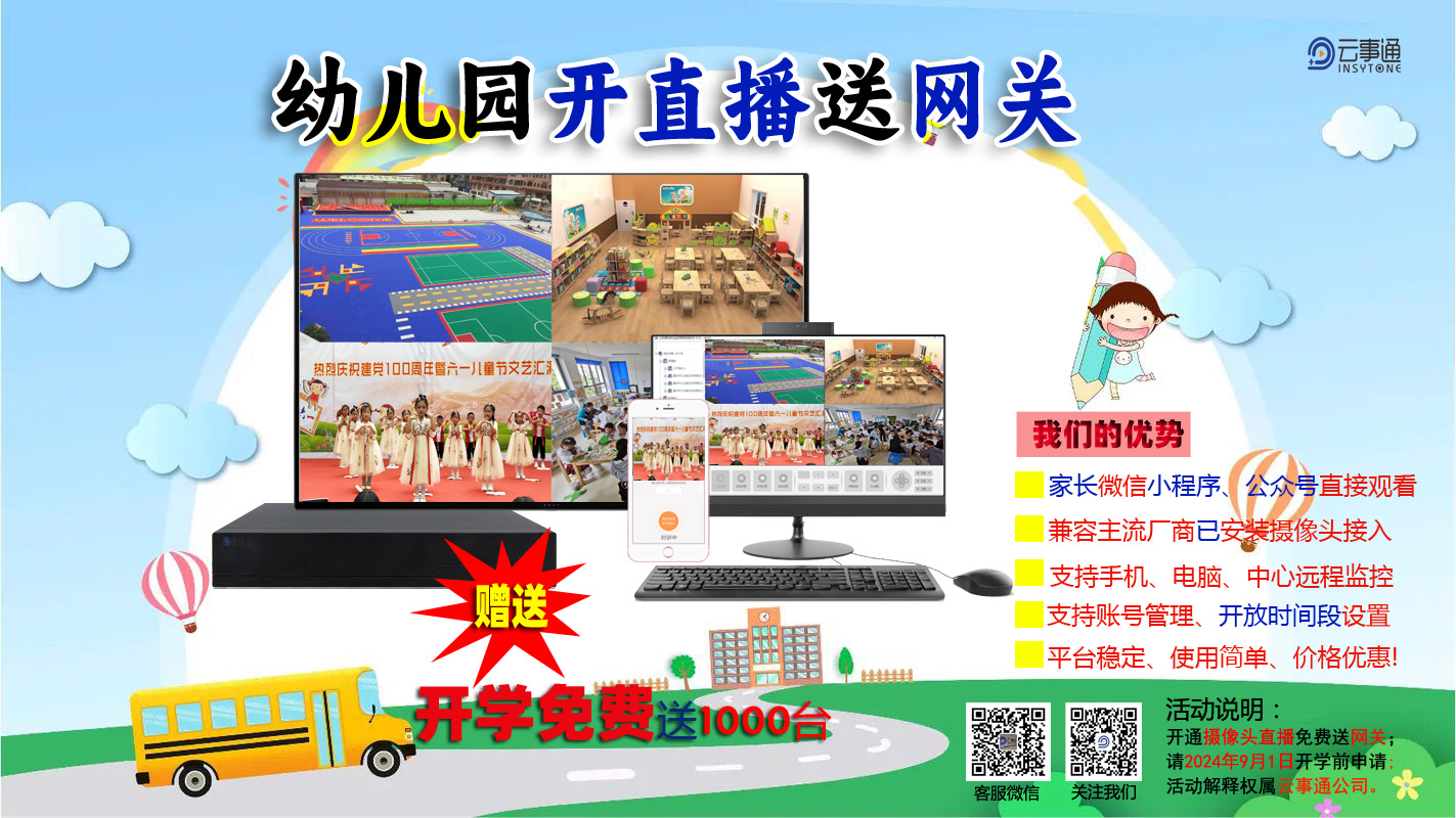 為了回饋幼教行業新老用戶,我公司在2024年9月1日開學之前申請攝像頭直播開通服務,免費贈送轉碼網關,網關兼容已安裝網絡攝像頭上云,滿足家長通過微信公眾號、小程序等觀看直播,活動先到先得,送完為目。