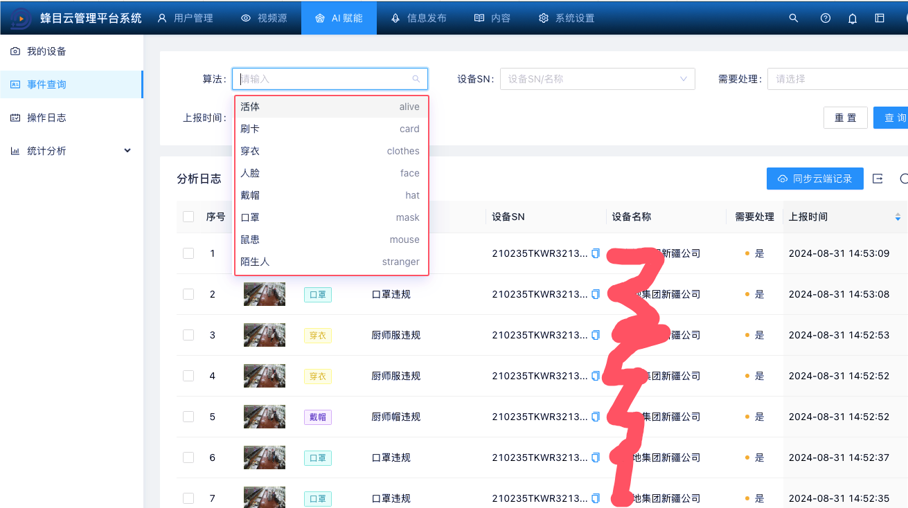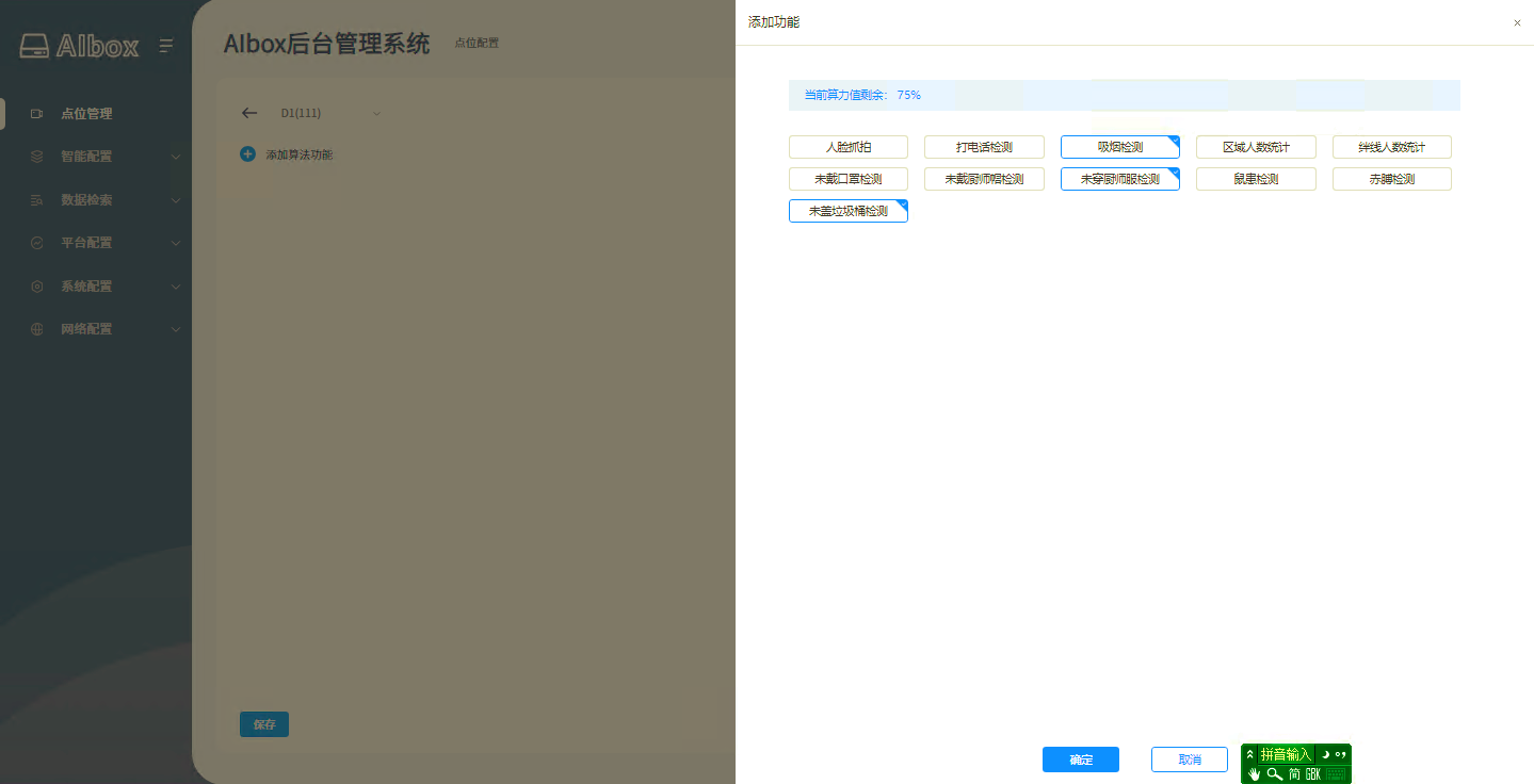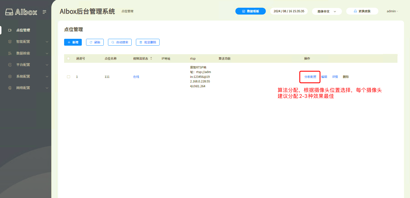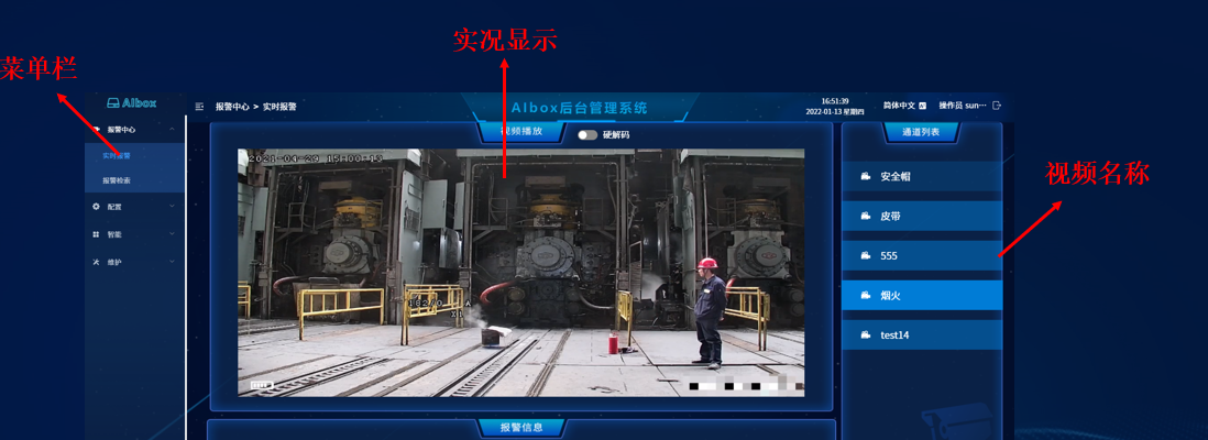 當(dāng)攝像頭接入成功,我們可以在“實(shí)時預(yù)警”欄看到視頻畫面,然后分配ai算法成功,開始智能分析功能。