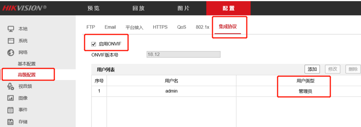 網(wǎng)絡(luò)配置---高級配置---啟用ONVIF協(xié)議或集成協(xié)議,添加管理員(與web登錄用戶名密碼一致即可)用戶,點(diǎn)擊保存;