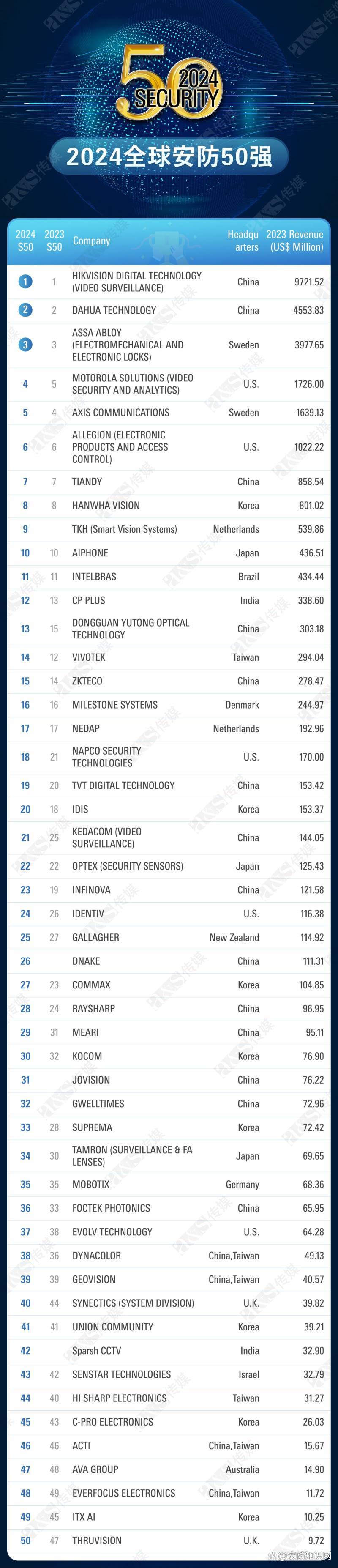 從物理安防領域排名前 50 的上市公司在2023 年安防產品銷售收入統計可以看到,今年的全球50強企業表現出積極的態勢。排名前 10 的公司——即海康威視、大華科技、亞薩合萊ASSA ABLOY、摩托羅拉系統、安訊士Axis、安朗杰Allegion、天地偉業、韓華Hanwha、TKH(智能視覺系統)和AIPHONE均實現了 2023 年收入的同比增長,從個位數到小兩位數不等。