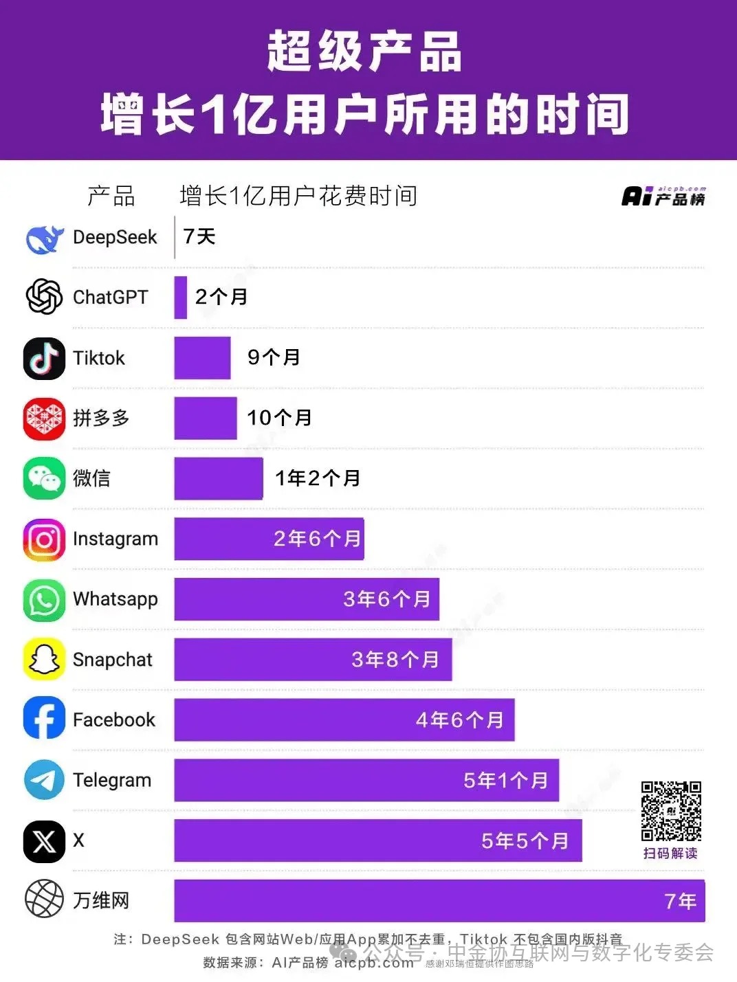 據(jù)AI產(chǎn)品榜的數(shù)據(jù)顯示,2025/01/20DeepSeek-R1 發(fā)布幾天后,在 1 月的最后一周迎來了爆發(fā),DeepSeek 在 1 月累計獲得1.25 億用戶(含網(wǎng)站(Web)、應(yīng)用(App)累加不去重)。其中 80% 以上用戶來自最后一周,即 DeepSeek 7 天完成了 1 億用戶的增長,這是在沒有任何廣告投放的情況下取得的,成為了名副其實的超級產(chǎn)品。
