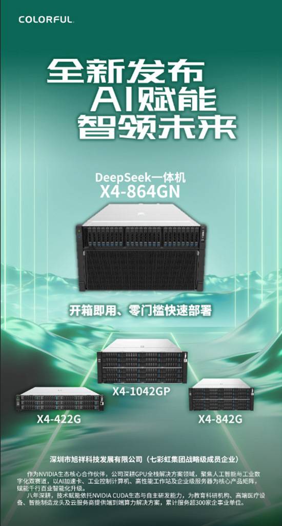 旭祥推出DeepSeek一體機(jī)型號(hào)為“X4-864GN”,搭載NVIDIA HGX高性能計(jì)算模組,適配DeepSeek全系列大模型,包括最新的V3基座模型、R1推理模型,以及其他蒸餾模型,可大幅降低DeepSeek模型部署的技術(shù)門檻。