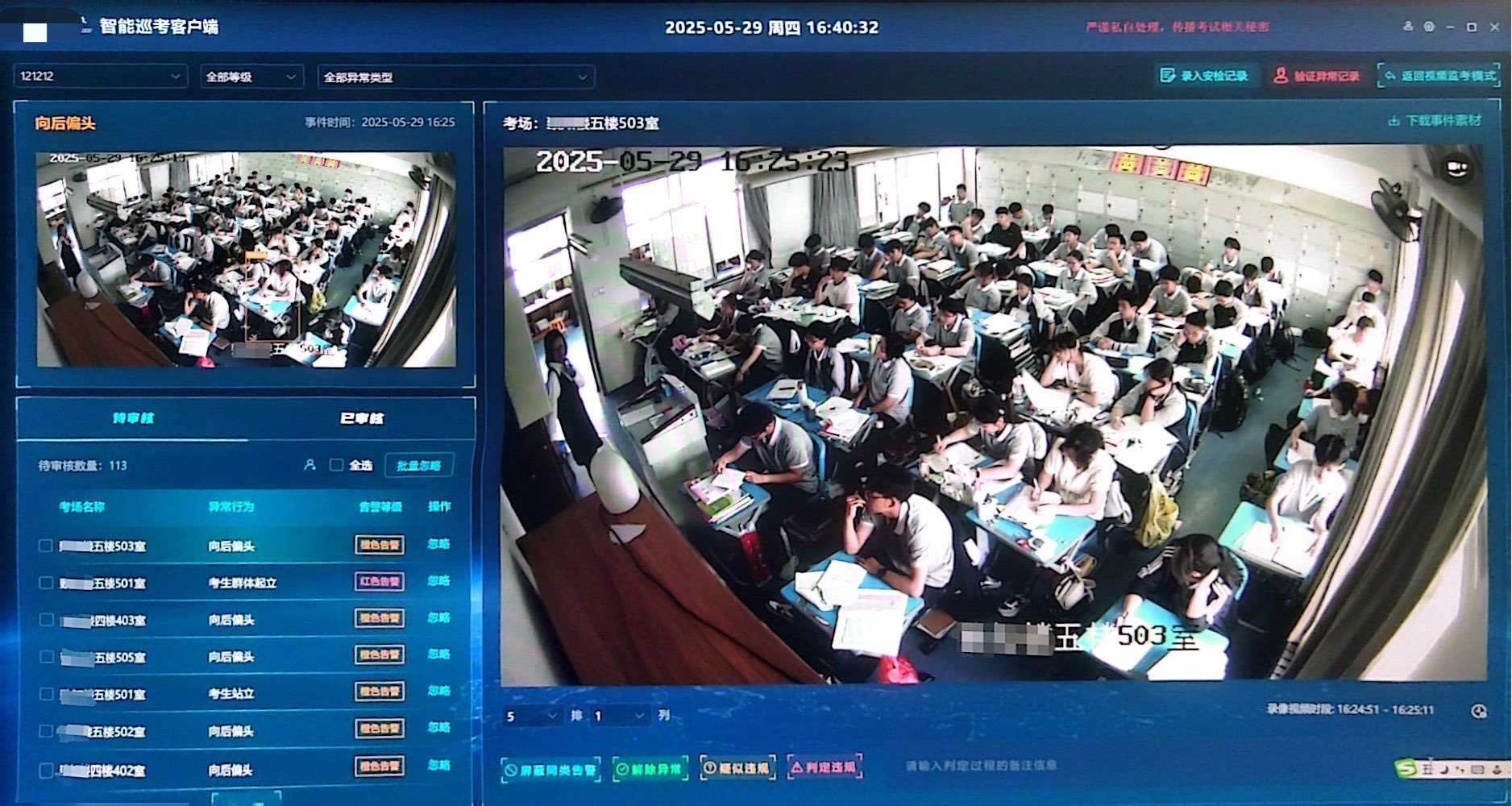 系統(tǒng)的核心突破在于顛覆傳統(tǒng)“事后追溯”機(jī)制,開(kāi)創(chuàng)“實(shí)時(shí)發(fā)現(xiàn)-現(xiàn)場(chǎng)處置”的新模式。通過(guò)AI算法對(duì)考場(chǎng)視頻的毫秒級(jí)解析,系統(tǒng)可精準(zhǔn)識(shí)別考生頻繁轉(zhuǎn)頭、傳遞物品等30類異常行為,并在0.5秒內(nèi)自動(dòng)框選目標(biāo)、標(biāo)注行為類型并推送預(yù)警。經(jīng)初審與復(fù)審兩級(jí)人工確認(rèn)后,監(jiān)考人員可立即干預(yù),極大提升作弊行為震懾力,有效解決人工監(jiān)考強(qiáng)度大、時(shí)效低、追溯難等痛點(diǎn)。此外,系統(tǒng)具備智能回溯功能,支持考點(diǎn)與上級(jí)部門(mén)通過(guò)關(guān)鍵畫(huà)面截圖、異常錄像等數(shù)據(jù)對(duì)考試全程進(jìn)行追溯審查,確保違規(guī)行為無(wú)處遁形。