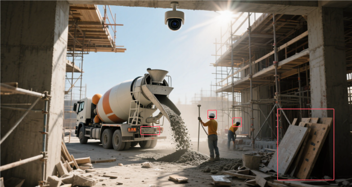 ?隱患識別功能?:能夠實時識別人員行為違規(如未佩戴安全帽、高空作業未系安全帶、進入危險區域等)、機械設備異常(如吊臂超載、挖掘機操作不規范、施工機械違規停放等)、環境安全風險(如臨邊洞口未防護、易燃物堆放不規范、消防通道堵塞等)等多種安全隱患與違規行為。