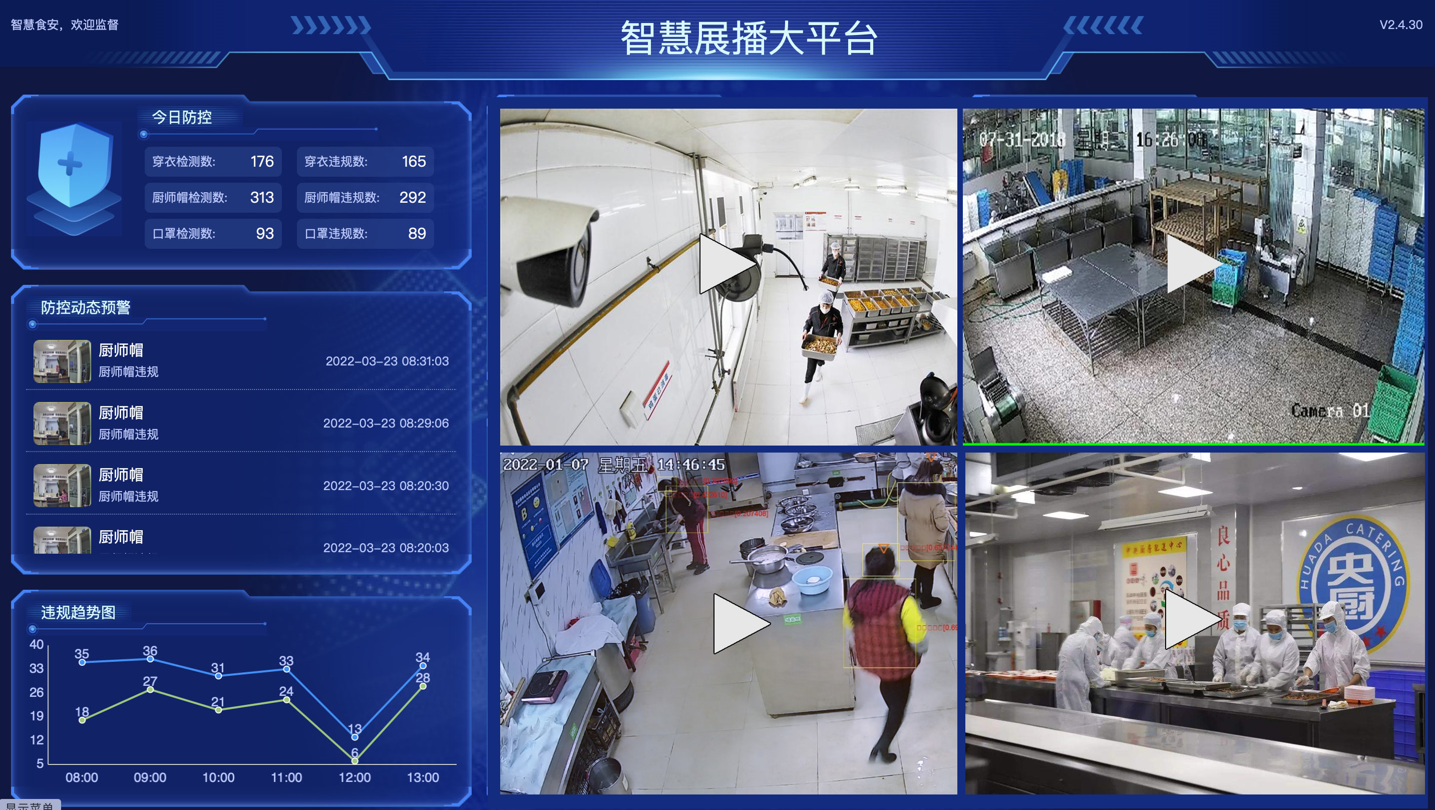 覆蓋關鍵區域?:攝像頭安裝位置需覆蓋粗加工區、烹飪區、專間及專用操作區域、餐飲具清洗消毒區等重點區域,確保能清晰看到廚房環境衛生、食品加工操作、人員穿戴及餐飲具清洗消毒等情況。